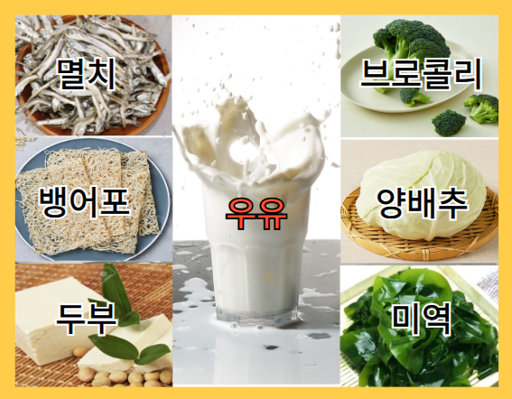 칼슘이 부족하면 골다공증 등의 질병에 걸릴 위험이 높아집니다. 우유 외에도 칼슘이 풍부한 멸치, 뱅어포, 두부, 브로콜리, 양배추, 미역 등 다양한 식품을 통해 건강한 뼈를 만들고 유지하는데 도움이 될 수 있습니다.
